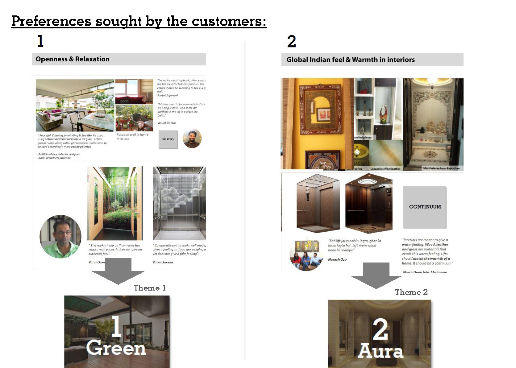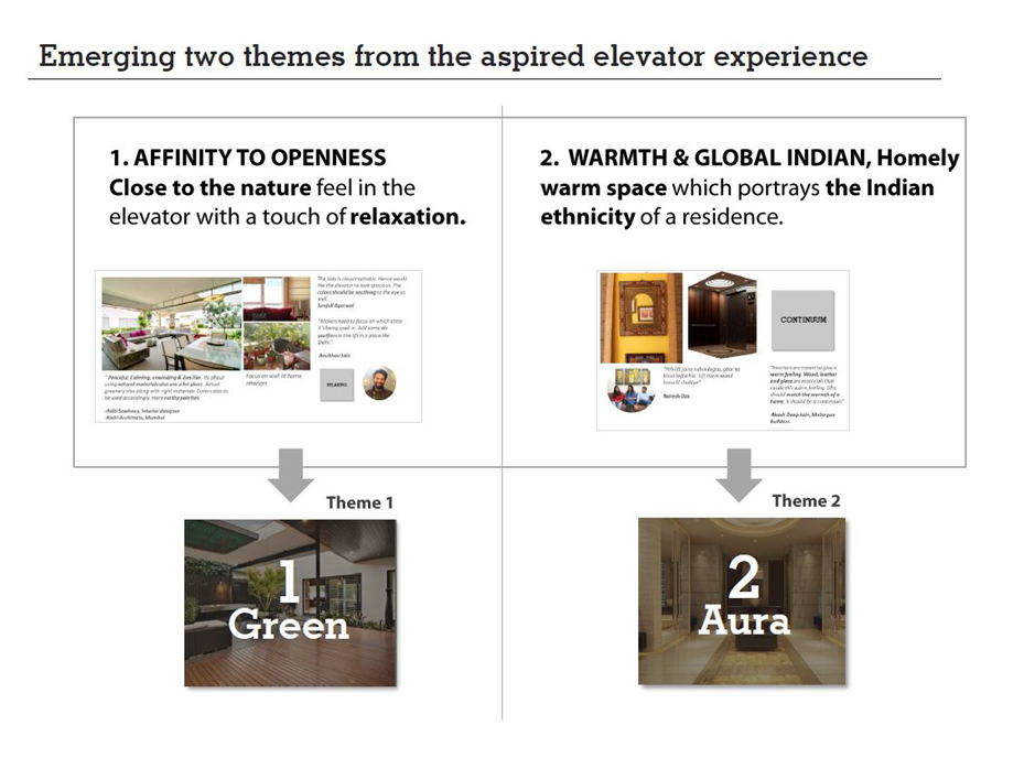 Based on the research insights we extrapolated visual design cues to give form to consumer aspirations. For example, "wellness" was a strong emotion emerging from the research insights. To capture it in form, we proposed seamlessness and rounded corners as a universal design detail across all elevator designs to reflect that emotion. The lack of visible nooks and crevices along with soft rounded corners create an inviting and comforting environment in an otherwise claustrophobic space. Additionally, it also introduced a new market definition in the elevator design space in India. We laid out our design guidelines under the phrase "Organic continuum" which reflects that aesthetic.